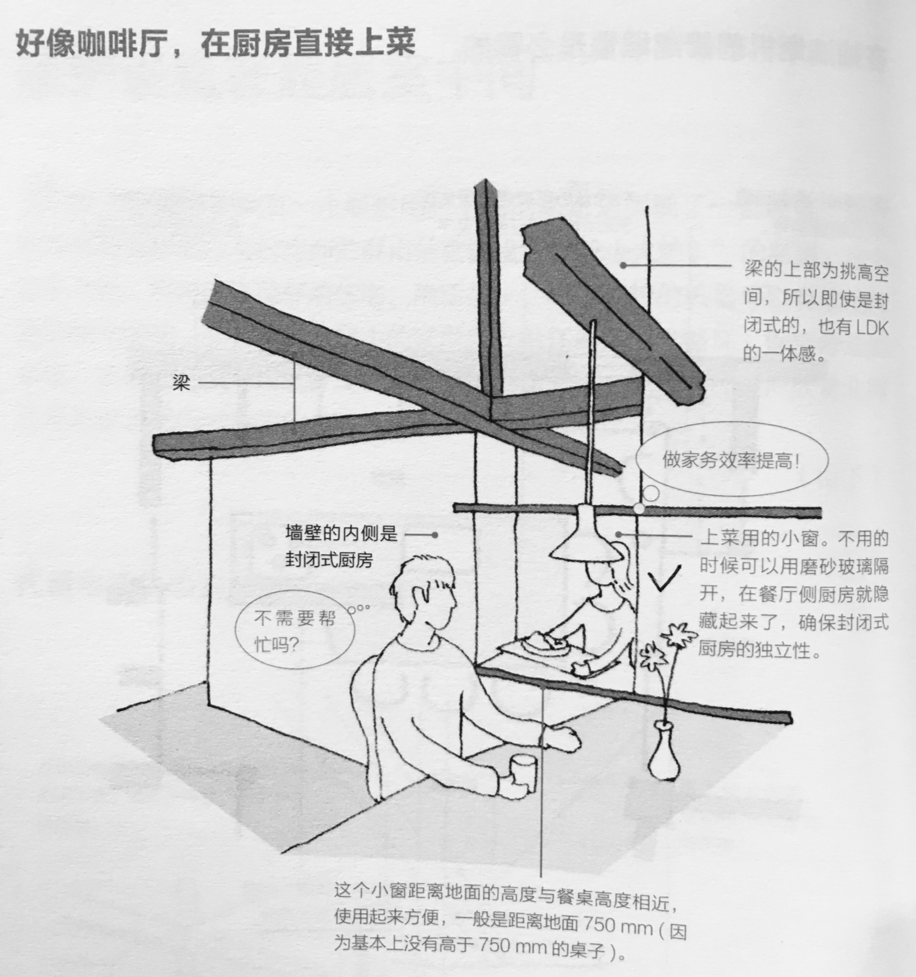 1、为了送餐的便利性,可在厨房与餐厅的隔墙上开一个送餐口,厨房里这个口用磨砂玻璃推拉,递餐时开着、不希望被打扰时就关上。