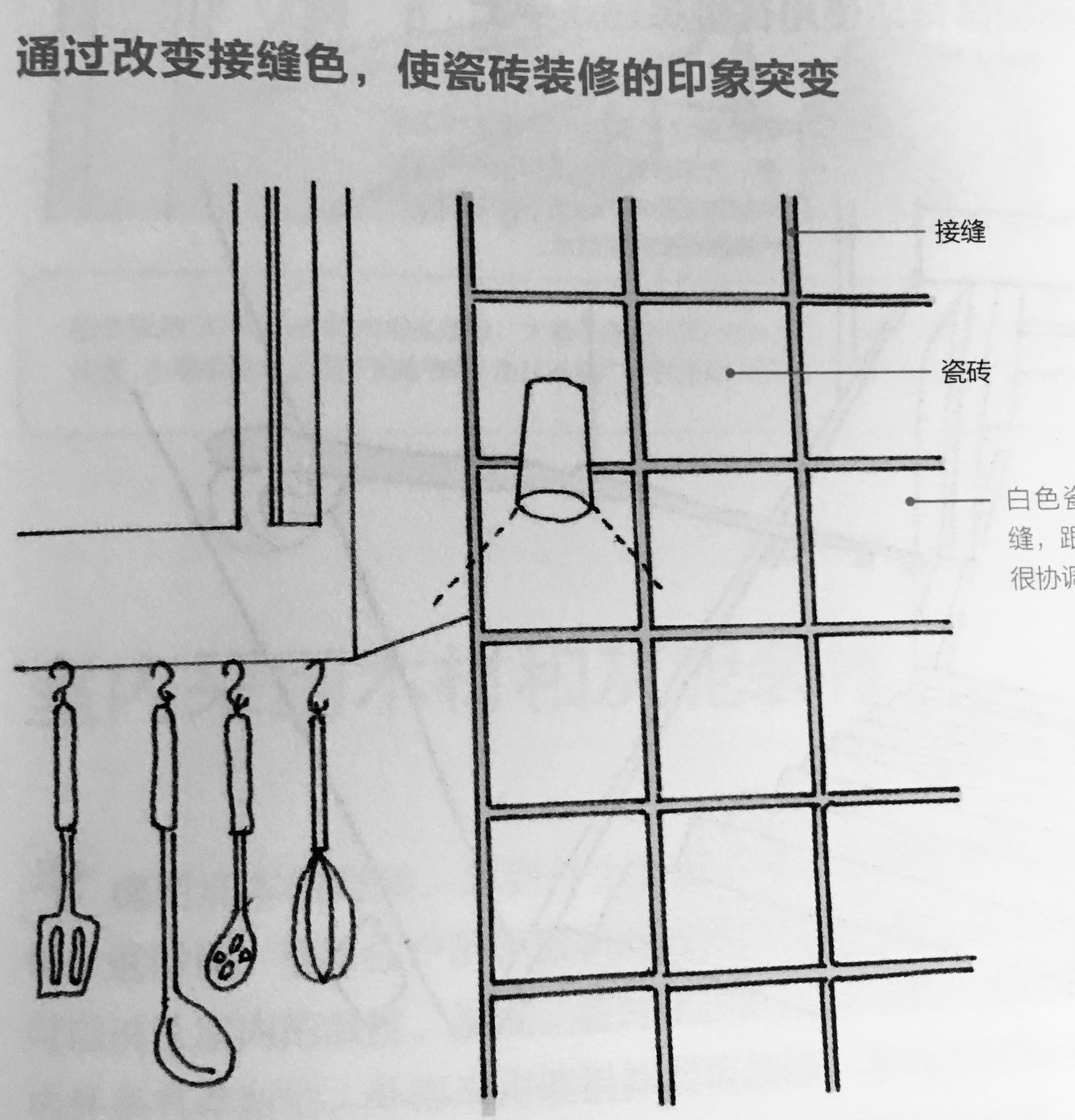 4、建议厨房的瓷砖接缝填色考虑与家具同色系,这样就不会太突兀。我们建议可以用白色或茶色系,白色是最常用也最干净的颜色、茶色系是因为一般家中的木制家具较多,与木制相同色系比较协调。