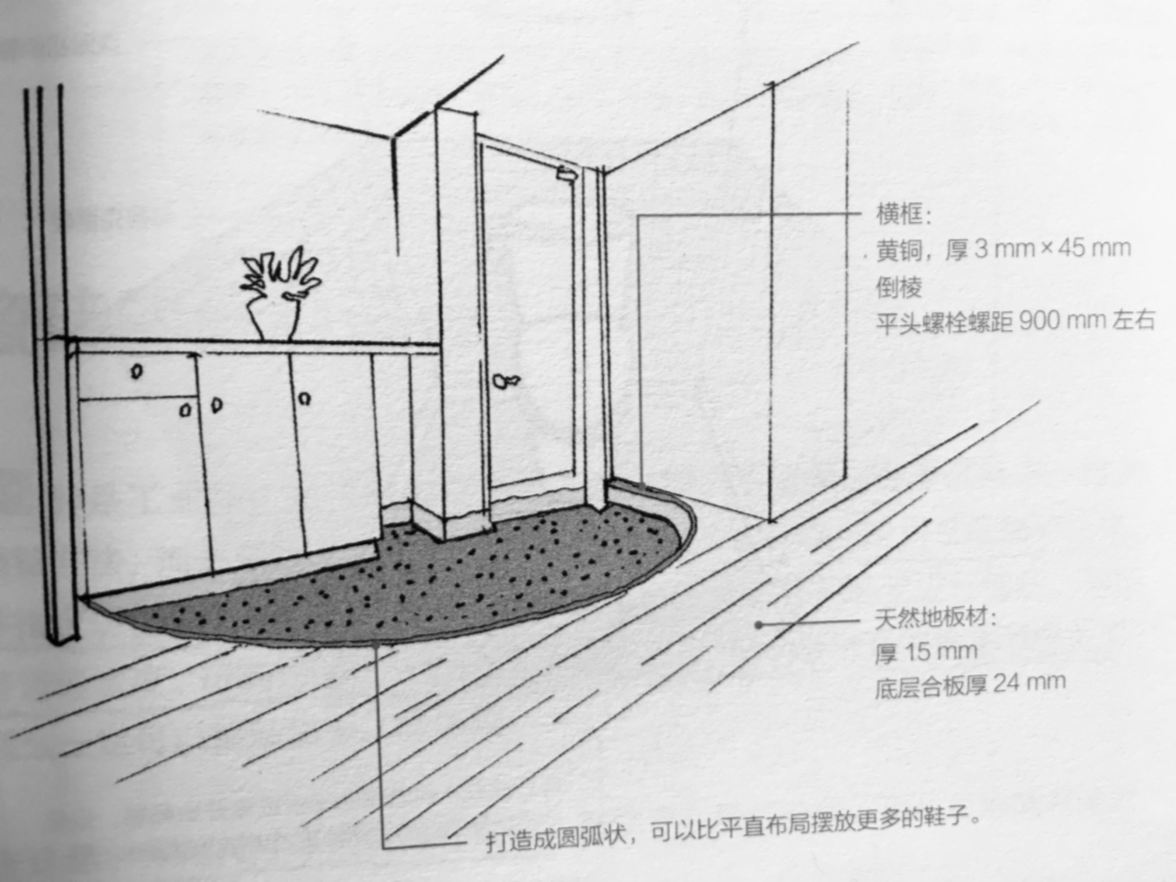 5、玄关地面还能采用半圆形,扩大鞋子踩踏的空间。