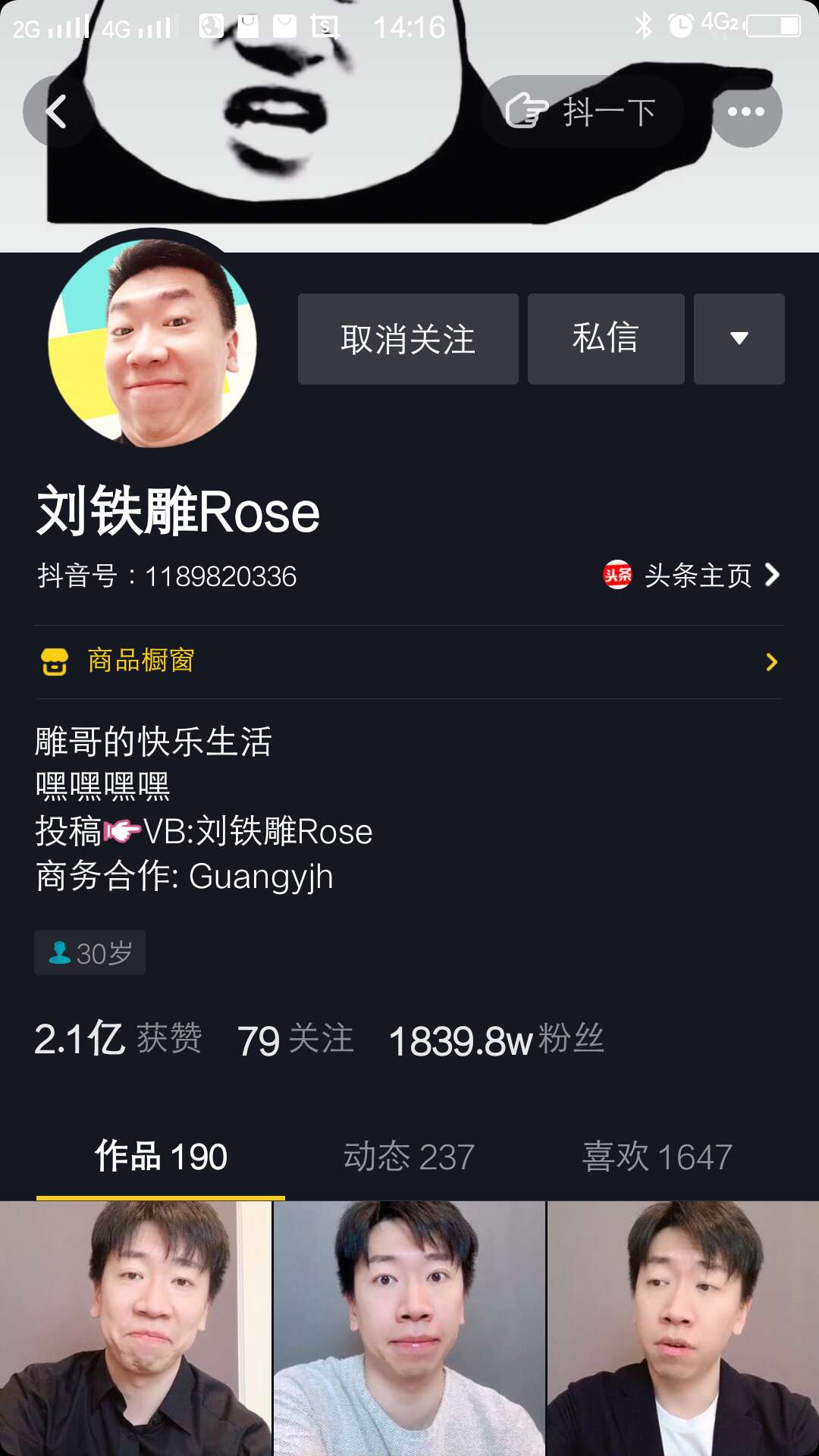 今天跟大家一起探讨一下抖音的一个比较牛的账号-刘铁雕Rose.