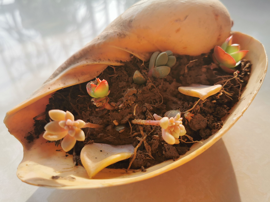 给我们四口人准备早中餐,期间给小女儿喂奶3次,把小女儿放在餐椅上,一边做菜一边跟她说话,告诉她妈妈拿的是什么东西,用来做什么。叫来大女儿帮忙打蛋黄、腌茄子。并用残留在碗里的蛋黄蛋清就着破碎的蛋壳,埋在花盆的土里,给土壤施肥,顺带用破旧的玩具喇叭种了一小盆多肉。