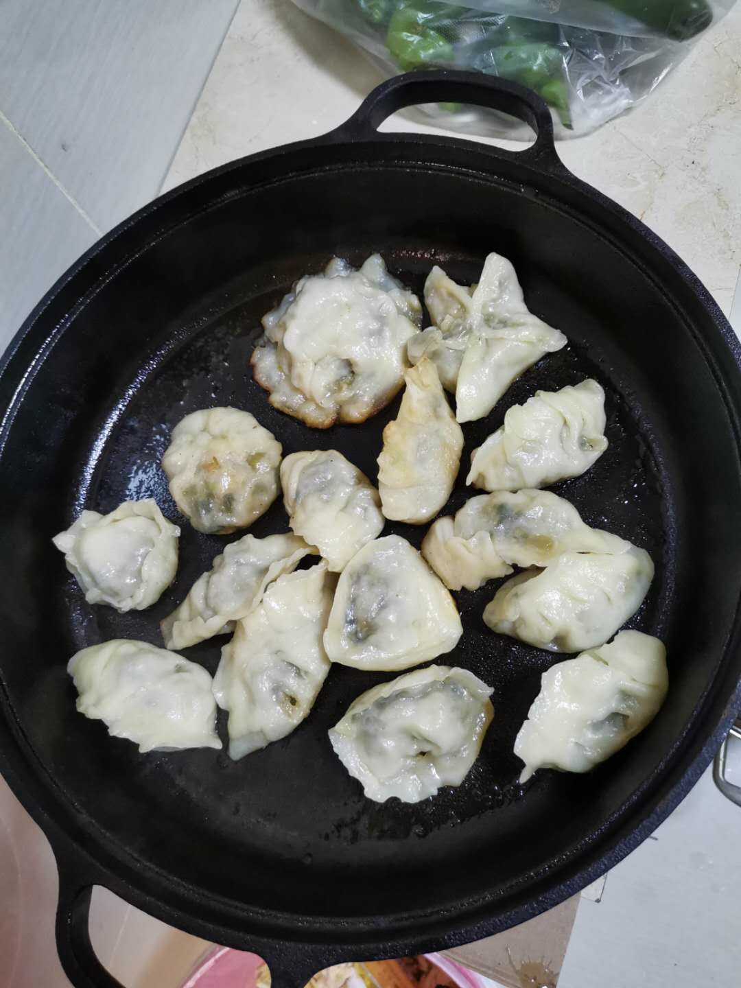在照照的建议下我们尝试了做煎饺,开始都没做过,心里没底,怕煎糊了,又怕弄不熟,在煮的时间反复揭开锅盖看,终于像是熟了,尝了一个,哇!好吃。