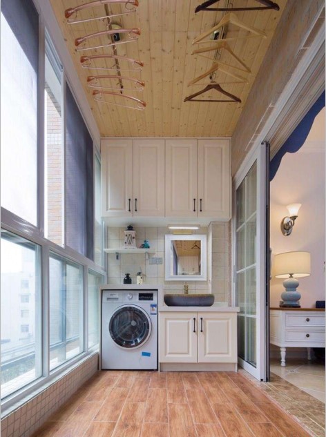 洗衣机,烘干机都是阳台必备。就算这样,我还是建议大家在阳台顶面和地面,还有墙面的设计上多花些功夫,要看起来舒服。阳台是一个独立空间,所以大可不必考虑风格的统一,只要你喜欢,啥风格都可以尝试。