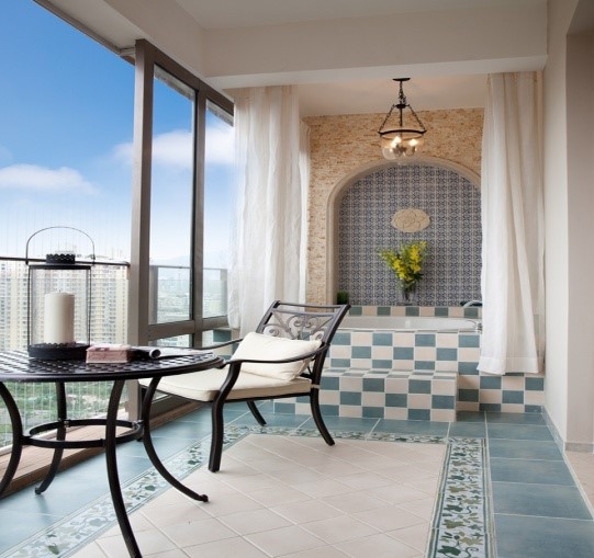 瓷砖风格的变化,木地板和瓷砖的配合,防腐木也可以作为地面材料之选。至于在阳台泡澡,就看你对自己的身材有多自信了,毕竟现在手机的像素太高了,嘿嘿。。。。。。(此处省略一万字)