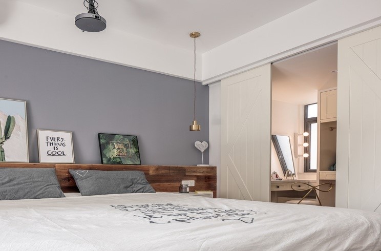 这两年开始流行开放式壁挂衣帽间的设计,这种设计源于服装店的陈列方式。减少了活动衣柜柜体板的使用,主要采用预埋五金件配合活动挂钩的方式收纳衣物,适当的抽屉放置内衣袜子等,整体来讲,更加的节约全屋定制的柜体板材,同时也释放了空间,给人宽敞明亮的视觉效果。