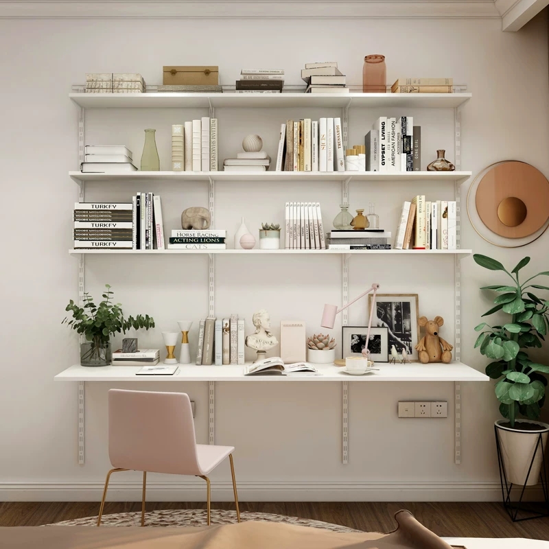 底座卡槽部位用膨胀螺丝固定墙面,当然墙面必须牢固,不能是石膏板隔墙。层板根据自己需求可以任意调节高度,这是传统定制无法比拟的空间优势。