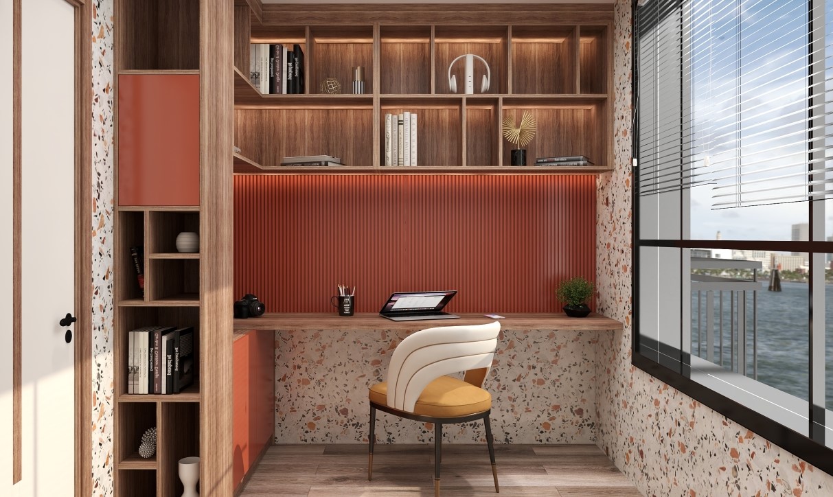 吃完了晚餐以后,男主人坐在橘色的书桌前,享受一个人的时光,给自己充电。