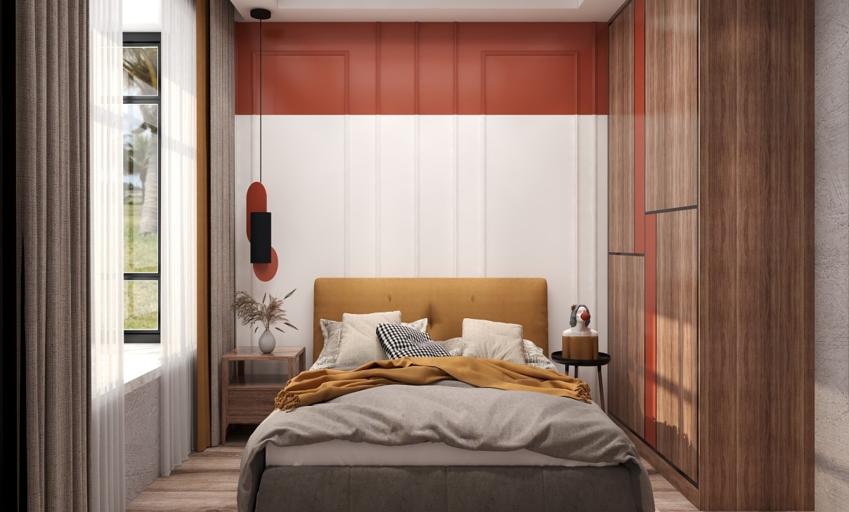 这套设计方案整体的色彩为胡桃木、白色、橘色。墙面大面积使用胡桃色的木饰面装饰,点缀部分橘色,稳重切温馨。